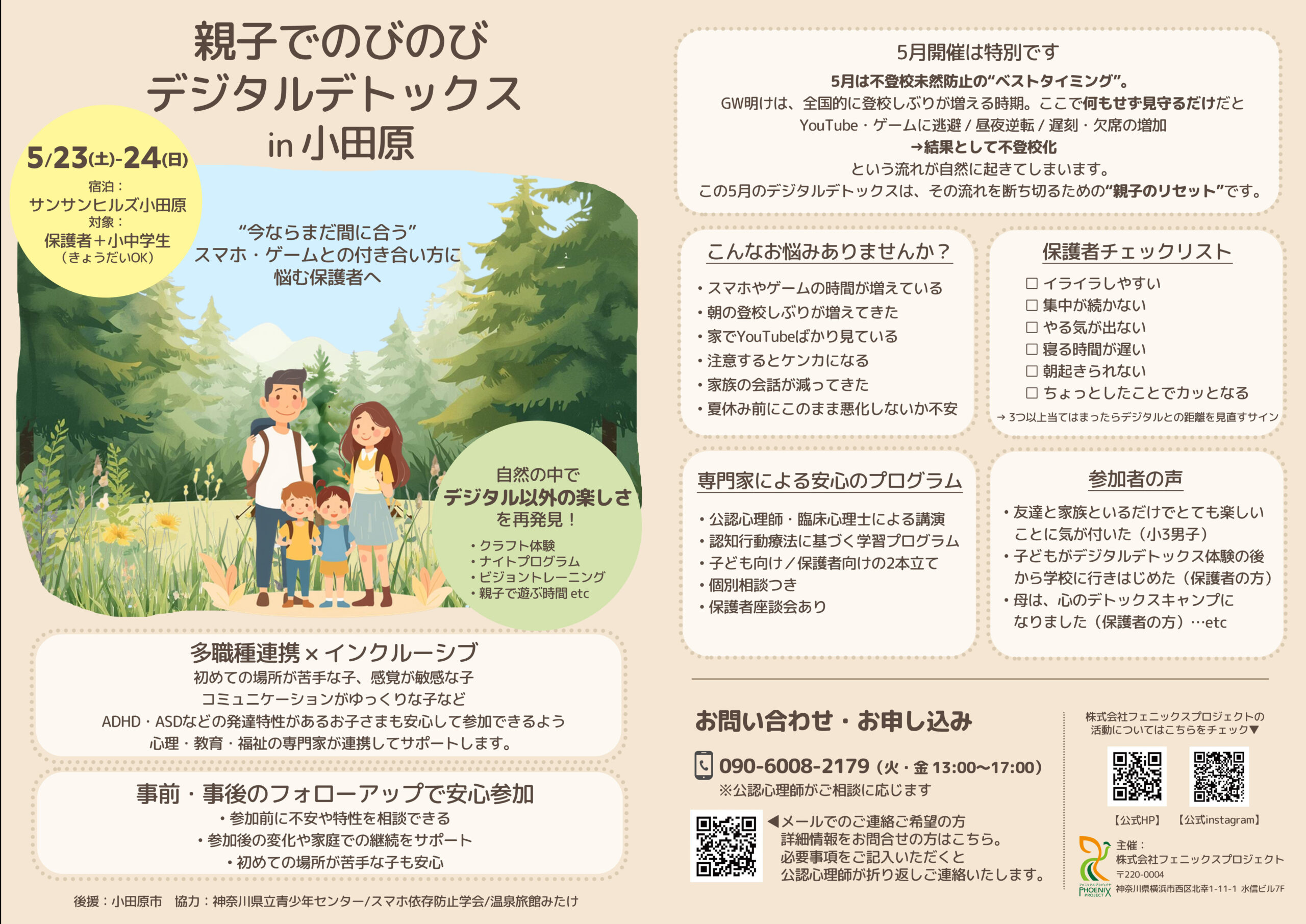 あと数日で4月、新年度が始まります。進級・進学は、保護者にとって我が子の成長が嬉しい反面「うちの子学校に楽しく通ってくれるかしら?」「新しいクラスになったら登校するって言っていたけど本当に登校するかな?」と心配なことがあるのもこの時期ですよね。また、あっという間に5月の連休明けになり、増えるご相談が「4月は何とか学校に行っていたんだけど・・」「遅刻が増えてカウンセラーに相談したら“しばらく見守りましょう”と言われたのですが・・」というものです。ただ見守るだけでは解決しないどころか、悪化する可能性があるのが、欠席中のデジタルデバイス使用ではないでしょうか?完全不登校未然防止のために、今だから必要な知識と経験を1泊2日親子で楽しく学びませんか?いきなり参加申し込みは不安ですよね?公認心理師が事前・事後のフォローアップをしっかり行います。まずはお問い合わせください!