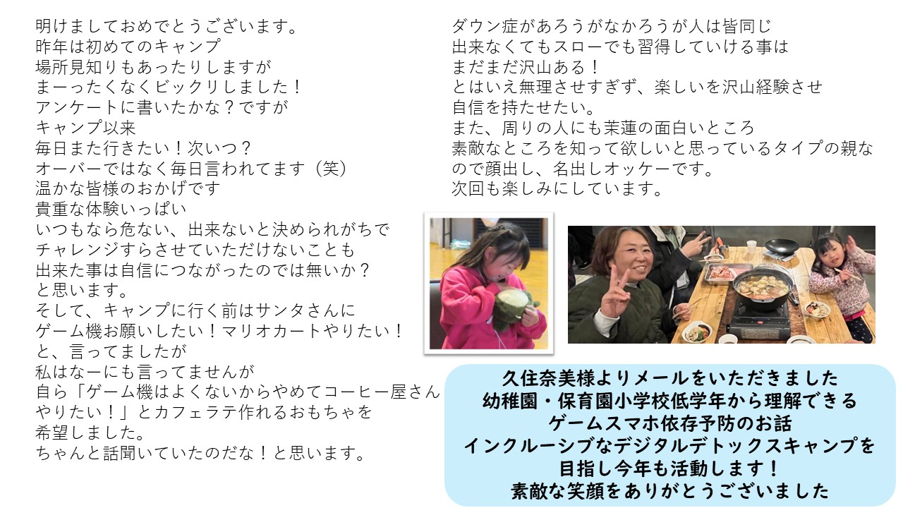 新年、嬉しいお便りを頂きました!あまりに嬉しかったので、原文そのまま掲載させていただきたいと思い、おねがいしたところ、久住様より快諾いただきました。今回久住さん親子に参加していただいたのは12月開催の宿泊デジタルデトックス体験会でした。子どもたちに向けてお話したスマホゲーム依存予防の時間は、小学校低学年のお子さんから分かってもらえるように何度も何度も内容を修正したのですが、分かってもらえたかな?難しい箇所もあったよね・・と思っていたので、茉蓮さんのサンタさんへのお願いの話を聞いて、やったー!届いたんだ~!と、スタッフ一同少しびっくり、じわじわ喜びで胸がいっぱいになりました。 私たち心理職・福祉職・教員・医療関係の多職種連携チームは「スマホ=悪・禁止」とは思っていないし、そんなことは一言もお話していません。デジタルデバイスが子どもの心と体に悪影響があるという事実を様々な資料と共に小さい子どもにもわかりやすく伝えること、そしてゲームではない楽しみを一緒に探すこと、学校以外の友達と仲良くなってみること、自然の中で親子で過ごす時間を味わってもらう、障害の有無によって参加に制限をしないで、誰もが安心して参加してもらうことが出来る日帰り/宿泊キャンプを構築しています。2026年はさらに開催地を増やして様々な企画をしています。今年もよろしくお願いします。