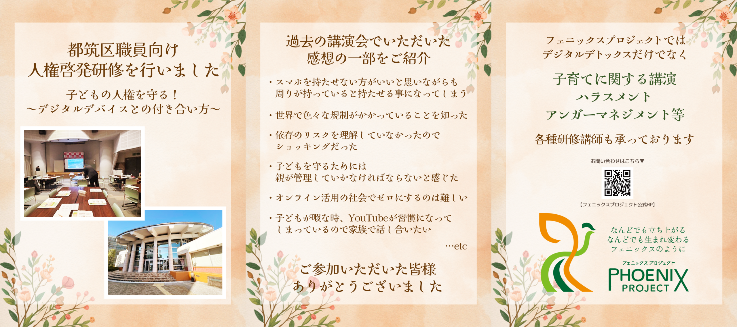 SNSスマホゲーム依存といったデジタルに関する研修・講演会以外にも、人権啓発研修・ハラスメント研修・アンガーマネジメント研修・メンタルヘルス研修など、それぞれの企業様のご要望をヒアリングの上、組織の課題解決に役立つ研修講師の派遣も行っております。お気軽にお問い合わせください。