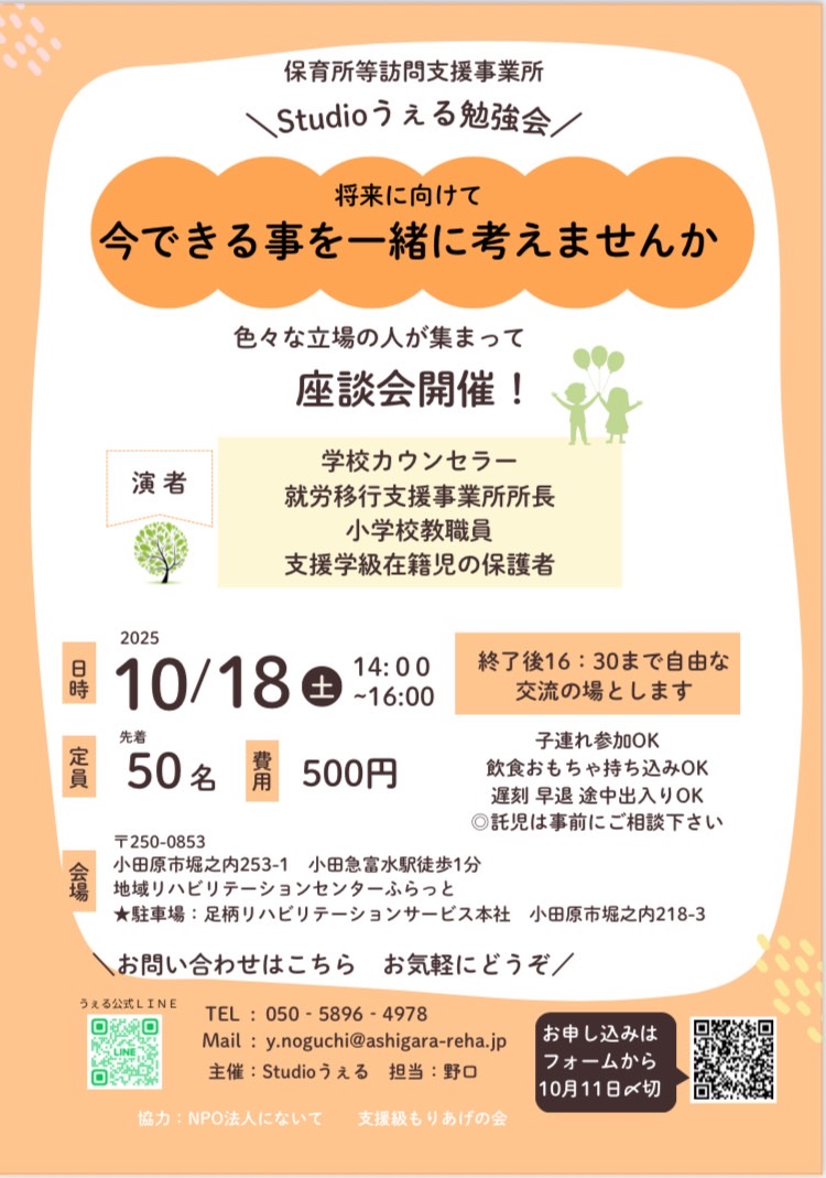 10月18日(土)14:00~16:00まで、小田原市の地域リハビリテーションセンターふらっとにて、Studioうぇる主催の「将来に向けて今できる事を一緒に考えませんか」というタイトルで座談会を行い、そのパネリストとして弊社澤口が登壇いたします。同じくパネリストのお1人でもある小学校教諭とは、過去の講演会でもご一緒させていただき、数年前にも関わらず名前を憶えていてくださり、今回、ご指名(笑)をいただきましたので、これはしっかりお引き受けしなければ!と今から気持ち引き締めています。駐車場もあります。自由交流の時間には、参加者の皆様がみんなの前では質問しきれなかったアレコレなどにもお答えさせていただこうと思っていますので、是非ご参加ください!