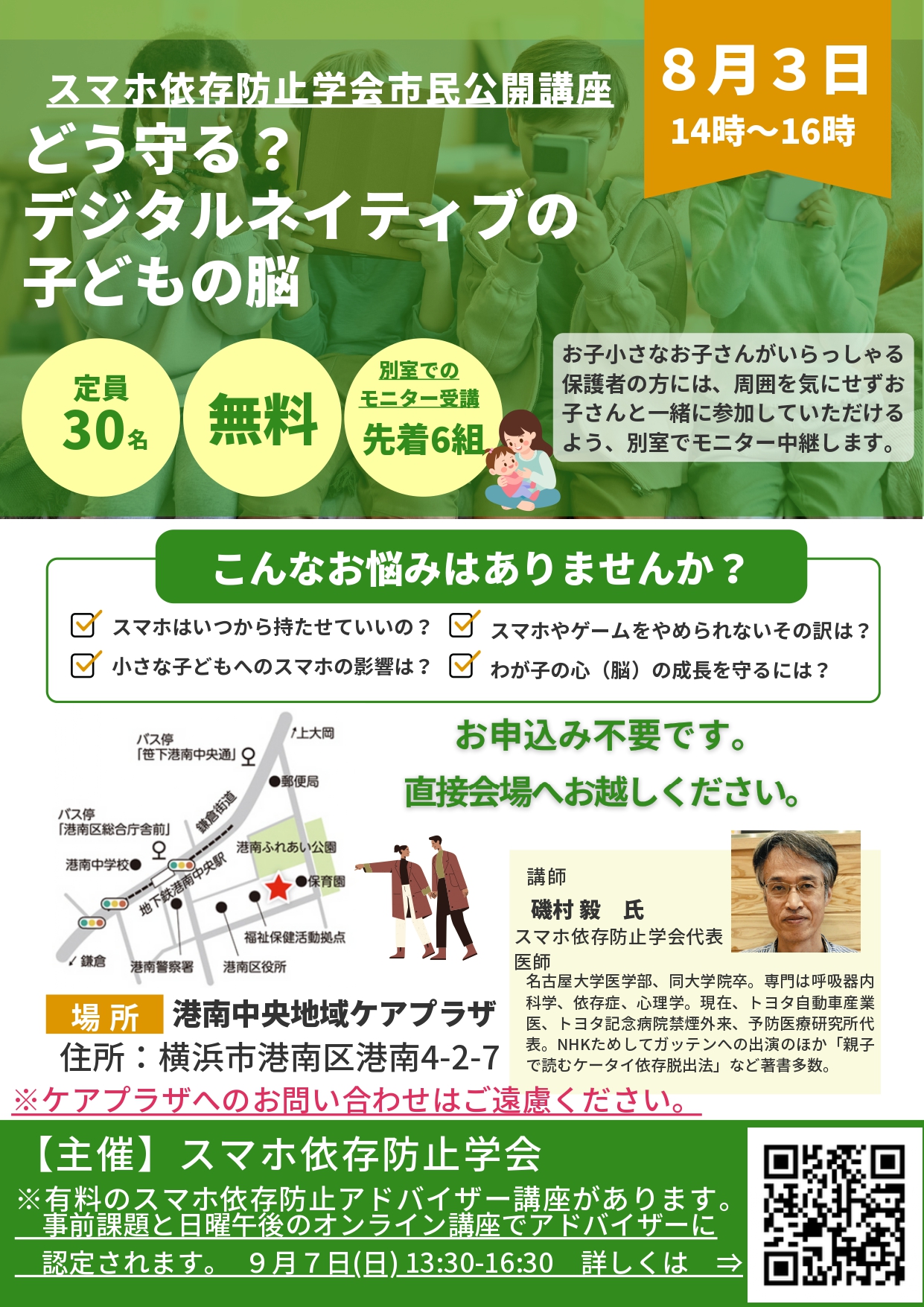 スマホ依存防止学会の総会を横浜市で開催します。2日目の8月3日14時からの無料市民公開講座では、磯村毅先生が「どう守る?デジタルネイティブの子どもの脳」というタイトルで講演を行います。磯村先生は著書も多数あり、日頃は、名古屋市を中心に全国で活躍されているため、直接質問することが出来る貴重な機会になります。申し込み不要です。小さいお子さん連れの方はモニター付きの別室があります。気軽にお立ちよりください。